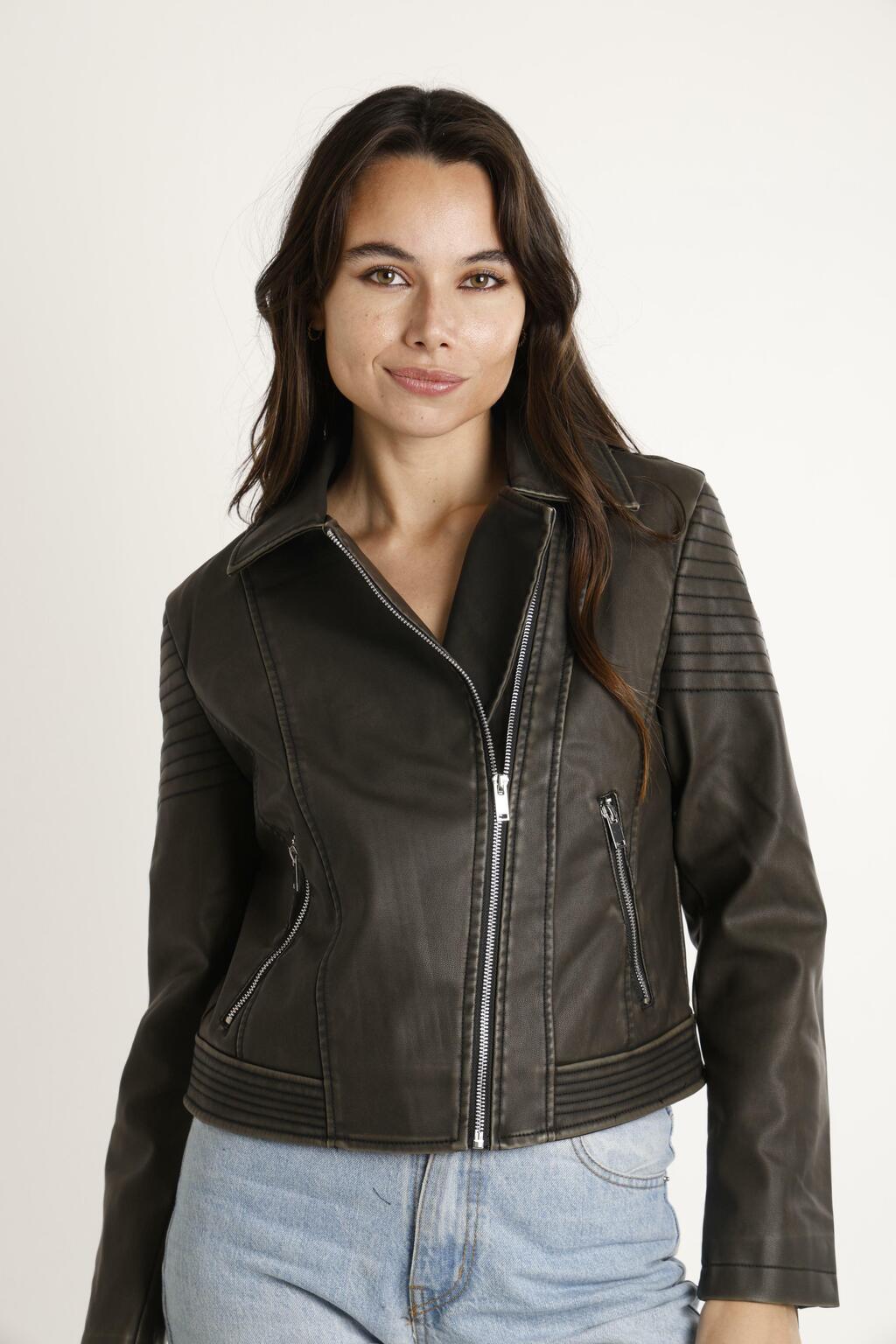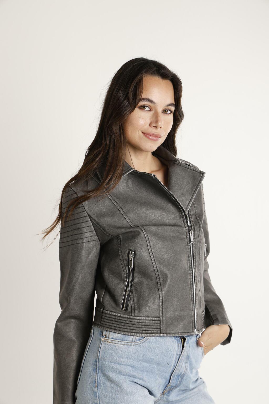 Campera Premium de Ecocuero Cruzada con Cierres y Bolsillos. Medidas Aproximadas: Talle S Sisa 47 cm Largo 50 cm, Talle M Sisa 49 cm Largo 51 cm, Talle L Sisa 51 cm Largo 52 cm y Talle XL Sisa 53 cm Largo 53 cm.